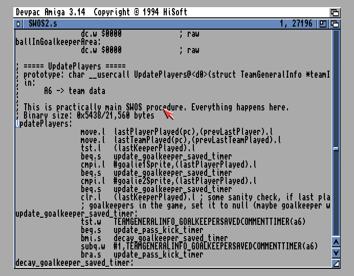 I've fully reversed Amiga SWOS and have it assembling a 1:1 binary of the original.